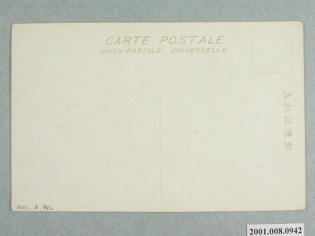 1. 本物件為以彰化南瑤宮為主題的黑白影像明信片,影像下方註有「南瑤宮前殿及兩廊之連續」;影像為拍攝南瑤宮前殿迴廊,右側有一廟門上繪有宮女門神。背面為明信片書寫面右上角有一方框為郵票黏貼處,右側註有「郵便はがき」,中央上方則標有兩段英文字「CARTE POSTALE」、「UNION POSTALE UNIVERSELLE」。2.彰化南瑤宮位於彰化縣南門外,1738年由瓦磘庄陳氏捐地建祠奉祀天上聖母,被稱為「媽祖宮」,後由吳佳聲、黃景祺、林君、賴武等發起募資建築本殿,雕塑五尊神像,取南門之「南」及瓦磘之諧音雅字「瑤」,正式定名為「南瑤宮」。