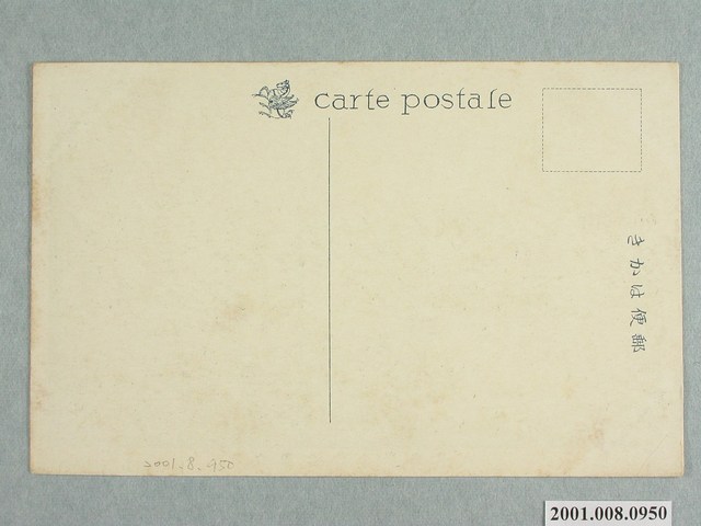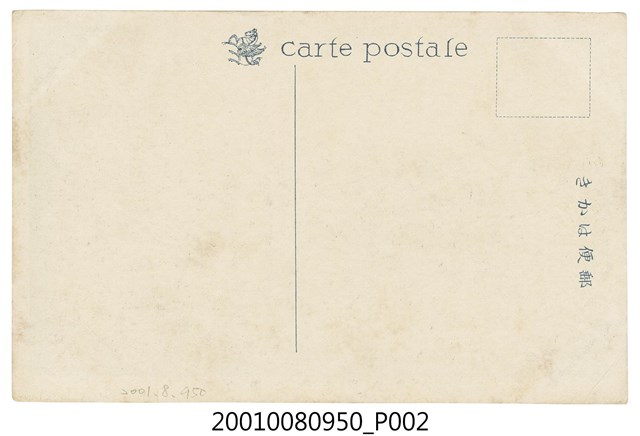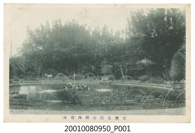 1. 本物件為以臺北北投公園為主題之明信片,其正面為北投公園噴水池黑白照片,影像以公園內的噴水池為主題,右側部分有一座涼亭,左邊部分的榕樹下方有一人坐在長椅上,影像下方標註「臺灣北投公園內噴水」。背面為空白明信片橫式書寫面,以深藍色單色印刷,右上角方框為郵票黏貼處,右側註有「郵便はがき」,上方有一飛馬圖樣,圖樣右邊以英文標有「carte postale」,中間有一分隔線。2. 北投公園為西元1913年臺北廳長井村大吉改建公共浴場同時規劃建設,依據1911年發布的「公園管理規則」,由臺北廳下各街庄共同經營,是全臺首座溫泉公園,公園規劃設施包含:鋪設水道、噴水池、公共浴場。