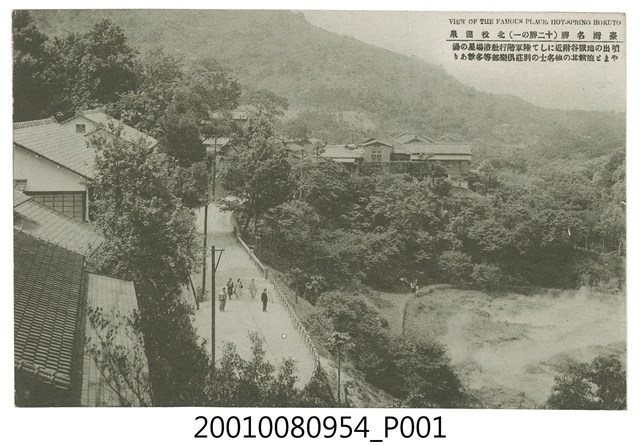 1. 本物件為以臺灣名勝北投溫泉為主題之明信片,其正面為北投溫泉黑白照片,影像左部分道路上有6名行人正在行走,右下蒸氣煙霧部分為地熱帶,邊緣有兩人站立,影像左上角標有三段文字「VIEW OF THE FAMOUS PLACE, HOT-SPRING HOKUTO」、「臺灣名勝(十二勝の一)北投溫泉」、「噴出の地獄谷附近にして陸軍階行社浴場星の湯やまど旅館其の他名士の別莊倶楽部等多数あり」(噴出的地獄谷附近有陸軍階行社浴場、星之湯、大和旅館及其他名人別墅、俱樂部等)。背面為空白明信片橫式書寫面,以黃褐色單色印刷,右上角有一方框作為郵票黏貼處,右側有「郵便はがき」,上方偏右位置有「UNION POSTALE UNIVERSELLE」、「CARTE POSTALE」,中間有一分隔線。