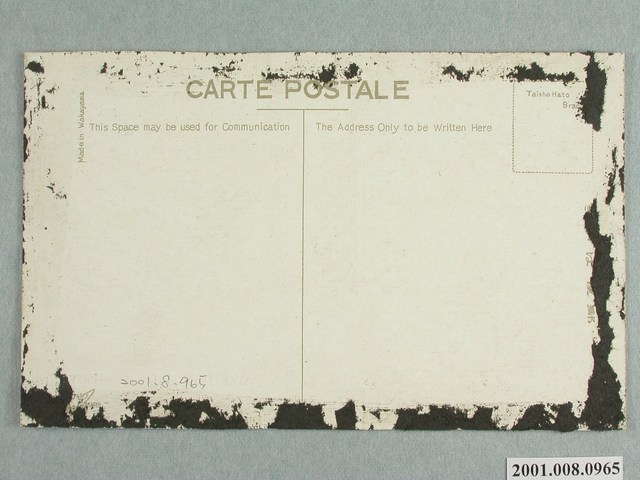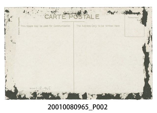 1. 本物件為以臺灣草山溫泉地區為主題之明信片,其正面為草山溫泉公共浴場黑白照片,影像左上角有兩段英、日文字「THE PUBLIC BATH–HOUSE, SOZAN HOT SPRINGS, TAIWAN.」、「(臺灣草山溫泉) 壯麗なろ」。背面為空白明信面橫式書寫面,以黑灰色單色印刷,四邊皆有黑色毀損痕跡,右上角方格內可辨識標有「Taisho Hato Brand」,明信片左側邊緣上以小字標有「Made in Wakayama」,上方以英文標為「CARTE POSTALE」,分隔線左側「This Space may be used for Communication」,右側「The Address Only to be Written Here」。