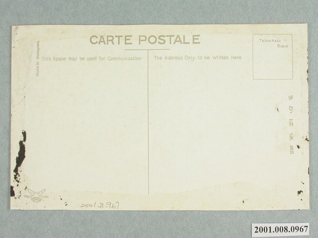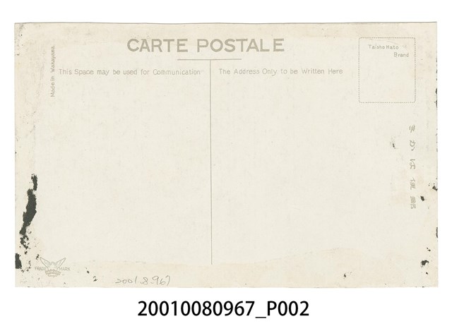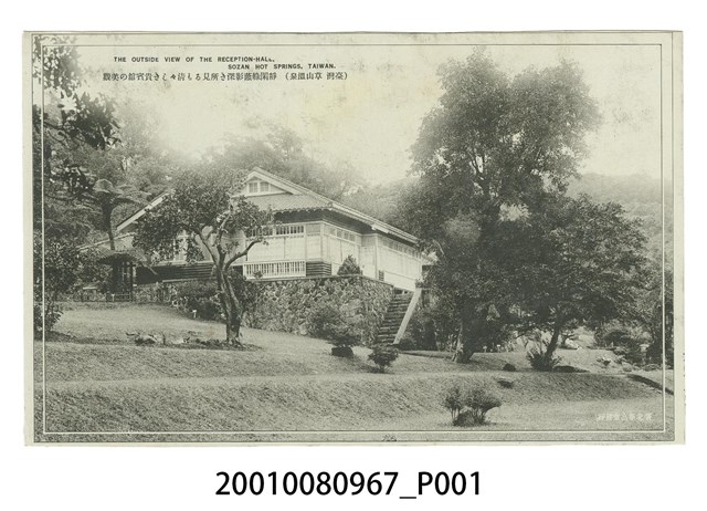 1.本物件為以草山溫泉區域為主題之明信片,其正面為草山溫泉貴賓館黑白照片,影像左上角以英、日文標記兩段文字「THE OUTSIDE VIEW OF THE RECEPTION-HALL, SOZAN HOT SPRINGS, TAIWAN.」、「(臺灣 草山溫泉) 靜閑綠蔭影深き所見るも清々しき貴賓館の美觀」,右下角處印有「臺北新高堂發行」。背面為空白明信片橫式書寫面,以黑灰色單色印刷,右上角方格內標有「Taisho Hato Brand」,右側註有「郵便はがき」,左下角有一張開雙翼,鳥爪上持「TAISHO」,並於兩邊寫有「TRADE MARK」的鳥形圖樣,左側邊緣上方以小字標有「Made in Wakayama」上方以英文標為「CARTE POSTALE」,分隔線左側「This Space may be use dor Communication」,右側「The Address Only to be Written Here」,中間有一道分隔線。