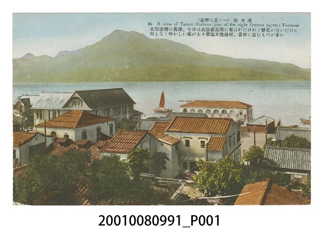 1.生蕃屋本店發行多色印刷明信片。圖為從淡水老街俯看淡水碼頭的街景,近淡水河處有一圓拱柱廊的洋樓建築,可能為已拆除的「淡水白樓」,上有說明文字:「(臺灣八景ノ一)淡水港 46 A View of Tansui Harbour(one of the eight famous sights.) Formosa、北部臺灣の舊港,今日は其殷盛基隆に奪はれたけれど歷史が古いだけに何となくゆかしい處があり廢墟其他詩材,畫材に富むものが多い。」(中譯:淡水港是北臺灣的舊港口,現在興盛的情形已被基隆取代,正因為歷史古老,到處都是引人入勝之處,歷史遺跡、或富有詩意、畫意的題材相當多。)背面印刷有「郵便はかき、POST CARD、(臺北 生蕃屋本店 發行)」等字。