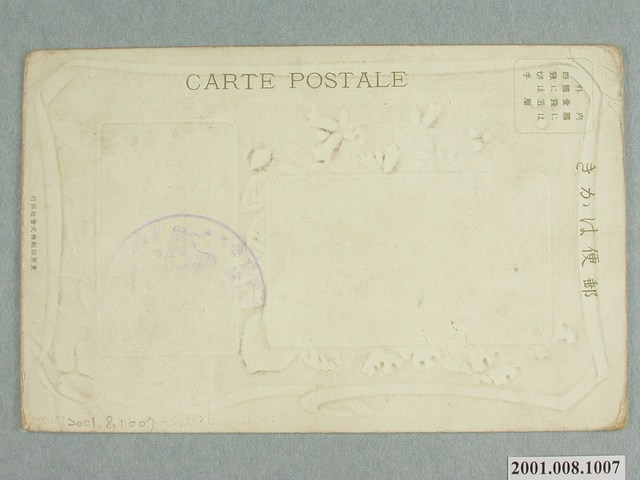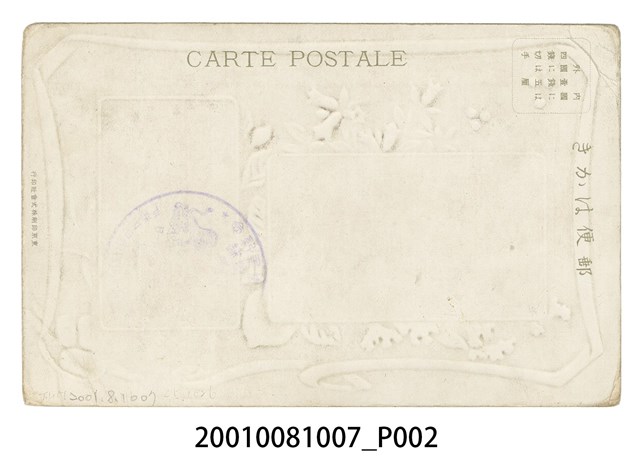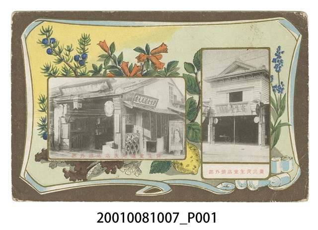 本物件為以臺北資生堂及滬尾資生堂支店為主題之明信片,其正面有兩張黑白照片,右邊為臺北資生堂店面黑白照片,影像中建築物招牌上寫有「資生堂藥鋪」,左側圓形招牌上寫有「千金丹」,下方標註「資生堂店頭外部」;左邊為滬尾資生堂外觀黑白照片,建築物上掛有招牌「資生堂滬尾支店」,下方標註為:「資生堂滬尾支店店頭外部」影像後方為彩色的插畫背景。背面為空白明信片直式書寫面,以黑色單色印刷,左上方方框內標註「內國には壹錢五厘、外國には四錢切手」(國內郵資為壹錢五厘,國外四錢。)右側標有「郵便はがき」,明信片底側側以中文字標有「東京印刷株式會社印行」,左方以英文標有「CRATE POSTALE」,左半部分蓋有一圖章,樣式模糊無法辨識。