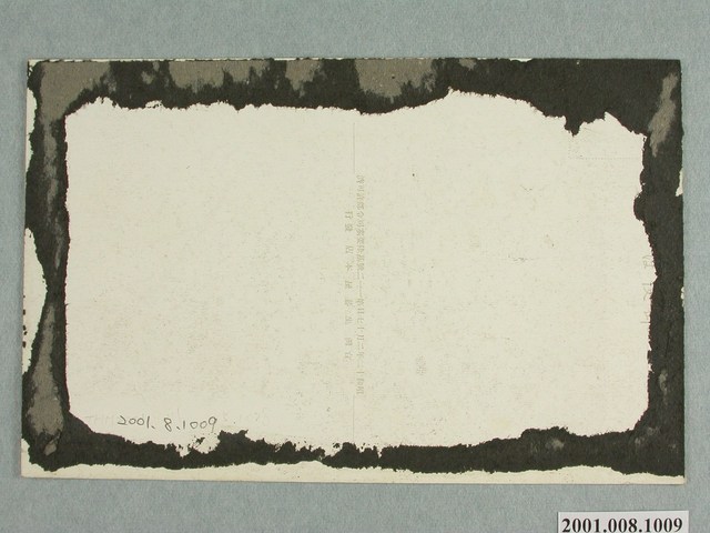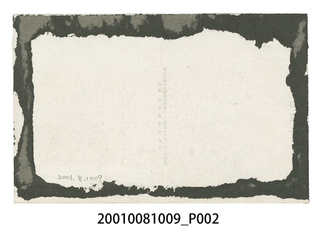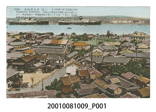 1. 本物件為以基隆港為主題之明信片,其正面為基隆港全景彩色繪圖,影像中左上角有兩艘貨輪,左上角標有三段英、日文字,「(臺灣)基隆港全景(其二)」、「A VIEW OF KEELUNG HABBOUR, FORMOSA」、「內地との連絡は定期船(隔日出帆)があり、郵船商船の一萬噸級客船六隻がこれに當りて居る、勿論貨物船は日毎に各方面より出入して大いに活況を呈して居る」(大意為描述基隆港船隻出入的情況。)背面為空白明信片直式書寫面,以黃褐色單色印刷,有部分黑色毀損,中間分隔線位置標有「昭和十二年二月十七日第一一二號基隆要塞司令部許可濟」、「臺灣生蕃屋本店發行」。2. 西元1895年,日本即對基隆港規劃了五期的築港工程,並有造船廠、軍港、漁港個機能區之外,亦規劃了港埠內的倉儲系統與鐵路運輸系統,在第二次世界大戰期間,亦為日本的後勤補給基地及海軍基地。