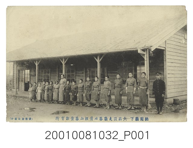 本物件為以桃園廳下大嵙崁支廳蕃童教育所為主題之明信片,其正面為蕃童教育所黑白照片,影像為蕃童教育所建築物之外觀,建築物右側站有1位身著深色立領制服的男性,旁為依照身高排列,並身著和服的男性,左半部有1位身著和服的女性,旁邊為身著和服、照身高排列的孩童。影像下方註有兩段文字,由右至左為:「桃園廳下大嵙崁支廳蕃地角板山蕃童教育所」、「齋藤商店發行」。