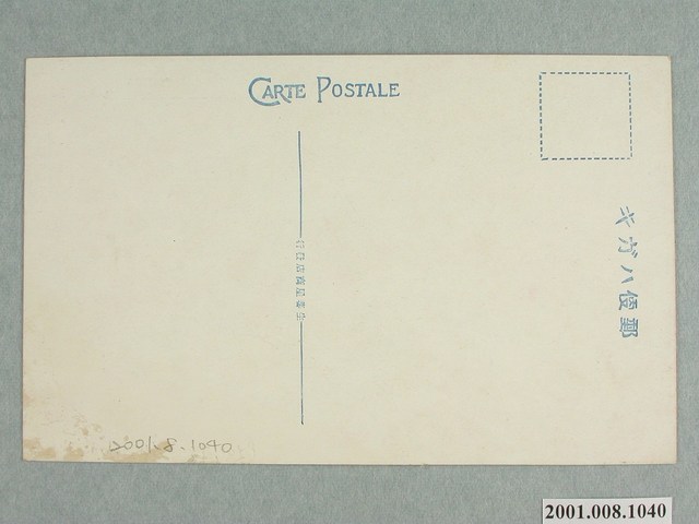 1. 本物件為以角板山貴賓館為主題之明信片,其正面為貴賓館建築外觀彩色繪圖,影像右上角以中、英文字標註「(台灣)角板山貴賓館」、「86. RECEPTION HALL KAPPANSAN」;背面為空白明信片直式書寫面,以藍色單色印刷,左上方有一不完整的虛線方框為郵票黏貼處,右側有「郵便ハガキ」,左側位置標有「CARTE POSTALE」,中間分隔線中央位置標註小字「MADE IN JAPAN」。