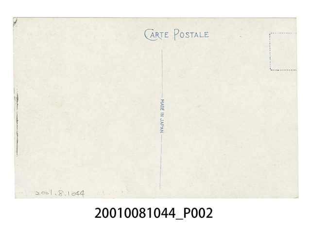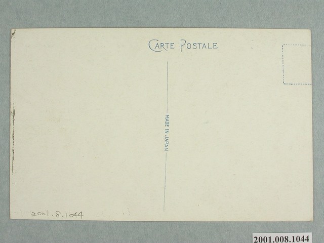 1. 本物件為以角板山貴賓館為主題之明信片,其正面為貴賓館建築外觀彩色繪圖,影像右上角以中、英文字標註「(台灣)角板山貴賓館」、「86. RECEPTION HALL KAPPANSAN」;背面為空白明信片直式書寫面,以藍色單色印刷,左上方有一不完整的虛線方框為郵票黏貼處,右側有「郵便バガキ」,左側位置標有「CARTE POSTALE」,中間分隔線中央位置標註小字「MADE IN JAPAN」。2.角板山貴賓館建於西元1914年,為日洋混合風格建築,原是供日本皇族住宿場所,戰後改稱蔣公行館,1992年火災,後改建為救國團復興青年活動中心。