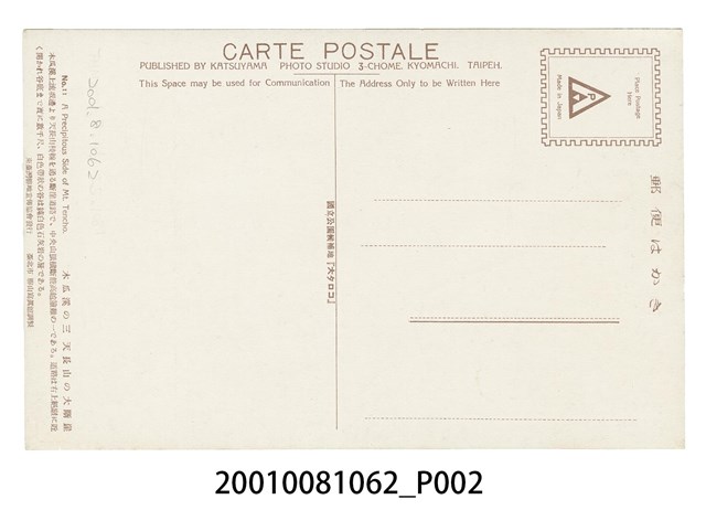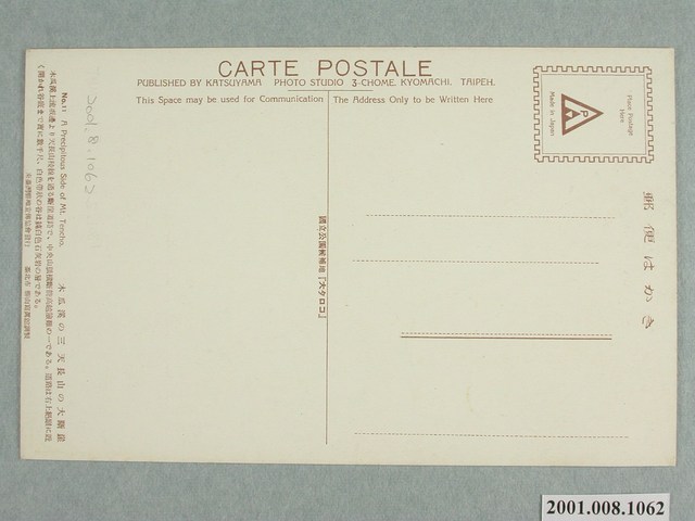 2.正面影像滿版印刷,無說明文字,背面則印有紅色字「郵便はかき、CARTE POSTALE、PUBLISHED BY KATSUYAMA PHOTO STUDIO 3-CHOME. KYOMACHI. TAIPEH.、This Space may be used for Communication、The Address Only to be Written Here、國立公園候補地『大夕口コ』」,以及郵票張貼方框內印有「Place Postage Here、Made in Japan」與「P」三角形商標圖案,說明文字為「No.11 A Precipitous Side of Mt. Tencho. 木瓜溪の三 天長山の大斷崖、木瓜溪上流坂邊より天長山稜線を通る斷崖通路で、中央山脈橫斷能高越險難の一である。道路は右上絕巔に近く開かれ谷底まで實に數千尺、白色帶狀の谷は純白色石灰岩の層である。東臺灣勝地宣傳協會發行、臺北市勝山寫真館調製」。