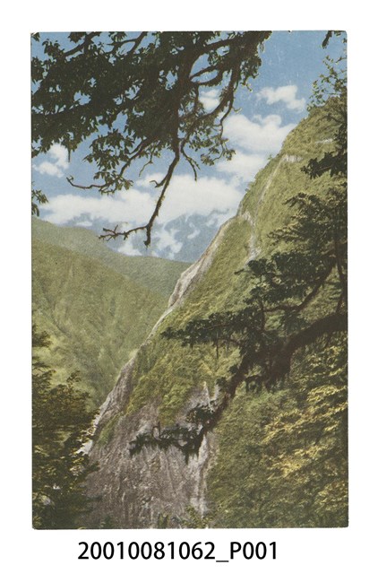 1.臺北勝山寫真館調製、東臺灣勝地宣傳協會發行之「大太魯閣繪葉書」(大タロコ繪はがき)系列明信片之一,多色印刷,影像內容為木瓜溪上游的天長山大斷崖,即能高越嶺道路東段的天長斷崖。
