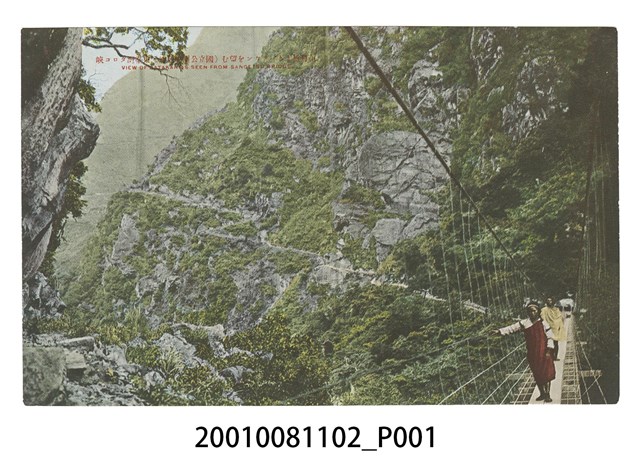 1.本件為花蓮片山寫真館發行之「東臺灣太魯閣峽谷」系列明信片之一,多色印刷,影像內容為從山月橋往巴達岡部落方向望去的吊橋景色,橋上站有2名原住民。山月橋建於1914年,橫跨於立霧溪上,為連絡布洛灣與巴達岡之間的吊橋。