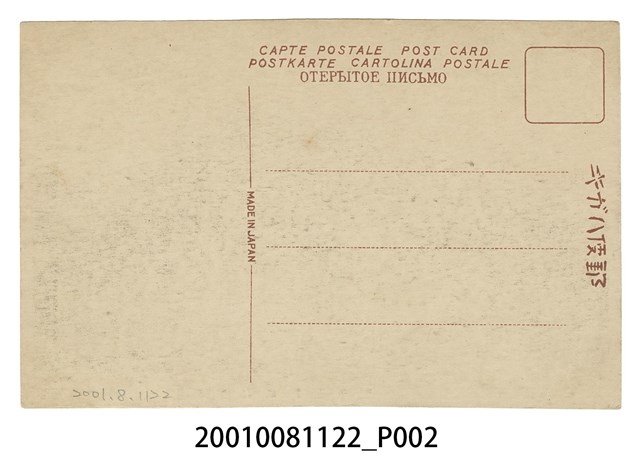 1.本物件為以新竹孔子廟大成殿為主題之明信片,其正面為大成殿黑白照片,下方印有兩段文字,由右至左為「新竹大成殿孔子廟」、「台灣新竹犬塚商店發行」,並於最左設標有阿拉伯數字「12」。背面為空白明信片橫式書寫面,以紅色單色印刷,右上角有一方框為郵票黏貼處,右側部分寫有「郵便ハガキ」,正中央上方寫有三段文字,由上至下為「CARTE POSTALE POST CARD」、「POSTKARTE CARTOLINA POSTALE」、「ОТКРЬІТОЕ ІІИСЬМО」,中央有一道分隔線,並標有「MADE IN JAPAN」。