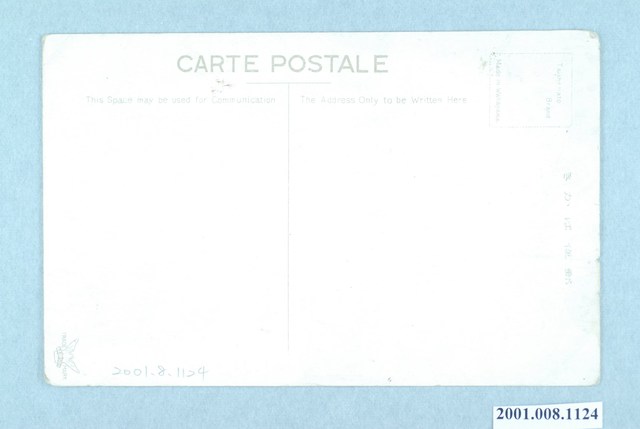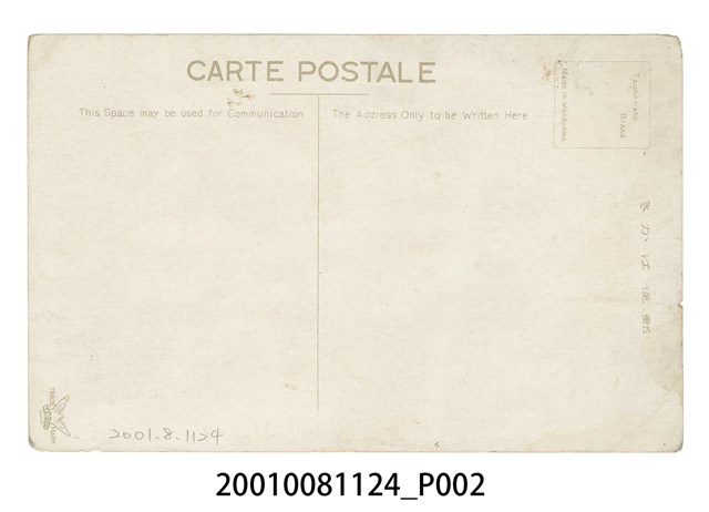 1. 本物件為以新竹公園為主題之明信片,其正面為新竹公園黑白照片,影像為公園中水池之影像,並於水池的對岸有一搭建於池岸立起的建築物,影像左下角標有兩段文字,由上至下為:「FINE VIEW OF SHINCHIKU PARK, SHINCIKU, FORMOSA」,「(臺灣.新竹)新竹公園の雅景」。背面為空白明信片直式書寫面,以黑色單色印刷,左上角方框中標有「Taishohato Brand」、「Made in Wakayama.」,方框右側有「郵便はがき」,右下方印有「TRADE MARK」及1隻張開雙翼的鳥,爪上持有「TAISHO」,左方為「CARTE POSTALE」,左下「This Space may be used for Commoncayon」、左上「The Address to be Written Here」,中間有一分隔線。