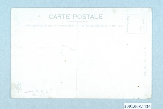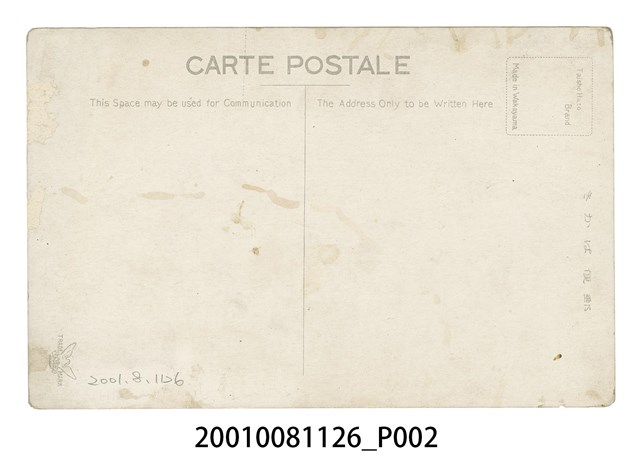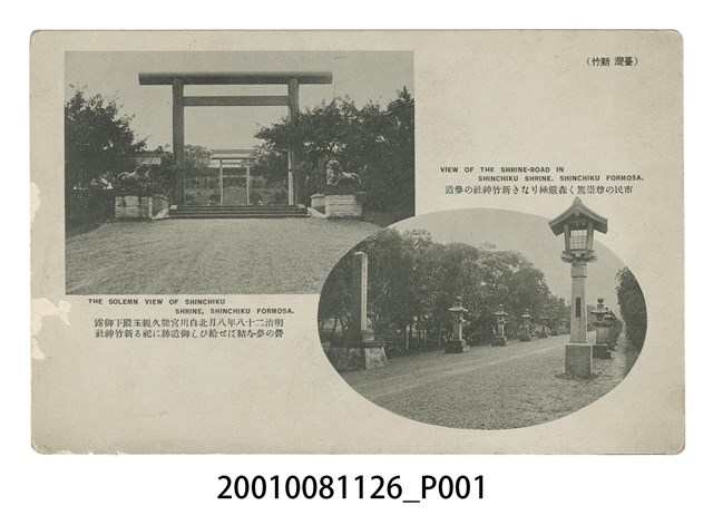 1.本物件為以拍攝新竹神社建築為主題之明信片,其正面為兩張新竹神社黑白照片,右方橢圓形為神社參道黑白照片,影像參道兩旁分別站有1排石燈籠,上方標註「VIEW OF THE SHRINE-ROAD IN SHINCHIKU SHRINE. SHINCHIKU FORMOSA.」、「市民の尊崇篤く森嚴極リなき新竹神社の參道」(大意為:深受人民敬崇且林蔭茂密的新竹神社參拜道路。)右上角為神社鳥居黑白照片,影像中有1座鳥居佇立,兩邊分別站有1隻狛犬,下方標註「THE SOLEMN VIEW OF SHINCHIKU SHRINE, SHINCHIKU FORMOSA.」,「明治二十八年八月北白川宮能久親王殿下御露營の夢を結ばせ給ひし御遺跡に祀る新竹神社」,右上角處標有「(臺灣新竹)」。背面為空白明信片直式書寫面,以黑色單色印刷,左上角方框中標有「Taishohato Brand」、「Made in Wakayama.」,方框右側有「郵便はがき」,右下方印有「TRADE MARK」及1隻張開雙翼的鳥,爪上持有「TAISHO」,左方為「CARTE POSTALE」,左下「This Space may be used for Commoncayon」、左上「The Address to be Written Here」,中間有一分隔線。2. 新竹神社於西元1918年建成,為總督府技師森山松之助,以及其助手八阪志賀助、手島誠吾設計建造。1938年由新竹州土木課技師手島誠吾設計重建,奉祀能久親王。位於新竹市郊崧嶺山麓,目前為內政部警政署入出境管理局大陸地區人民新竹處理中心管理使用。