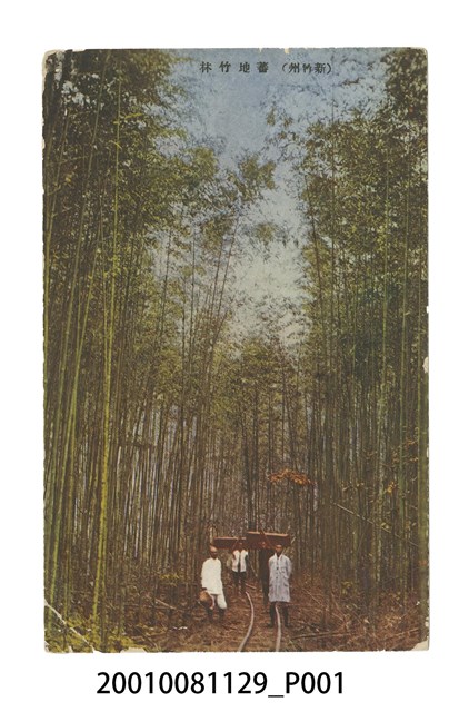 本物件為以新竹州蕃地竹林為主題明信片,其正面為竹林彩色照片,影像中竹林中央有一條軌道,於軌道附近站有4名男性,影像上方標註「(新竹州)蕃地竹林」。背面為空白明信片橫式書寫面,以藍色單色印刷,右上角有一方框為郵票黏貼處,右側部分寫有「郵便ハガキ」,正中央上方寫有三段文字,由上至下為「CARTE POSTALE POST CARD」、「POSTKARTE CARTOLINA POSTALE」、「ОТКРЬІТОЕ ІІИСЬМО」,中央有一道分隔線,並標有「MADE IN JAPAN」。