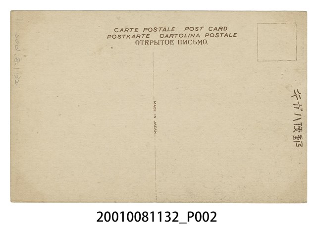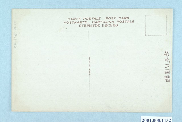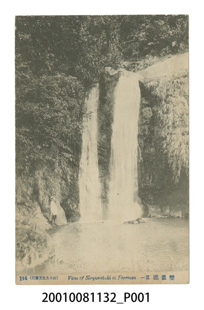 2.正面影像為黑白,下方印有藍色文字「195(鈴木勇進堂發行)View of Soryunotaki at Formosa、雙龍瀧 其一」,背面則印有棕色文字「郵便ハガキ、CARTE POSTALE、POST CARD、POSTKARTE CARTOLINA POSTALE、OTKPbITOE IINCbMO、MADE IN JAPAN.」,以法文、義大利文、德文、英文、俄文等語言標示明信片。