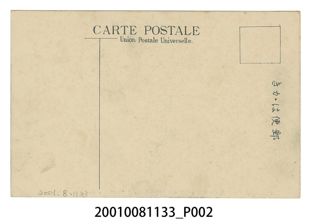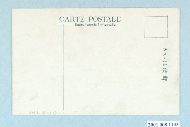 2.正面影像為黑白,下方印有藍色文字「新竹廳管內ノ蕃地ニアル三溪合流點ノ中央ニ屹立セル尖石ト稱スル巖石ニシテ高六十尺余」(譯:在新竹廳內的原住民地區,三溪滙流點的中央屹立著一塊尖石,高60餘日尺。),背面則印有深藍色文字「郵便はかき、CARTE POSTALE、Union Postale Universelle.」。