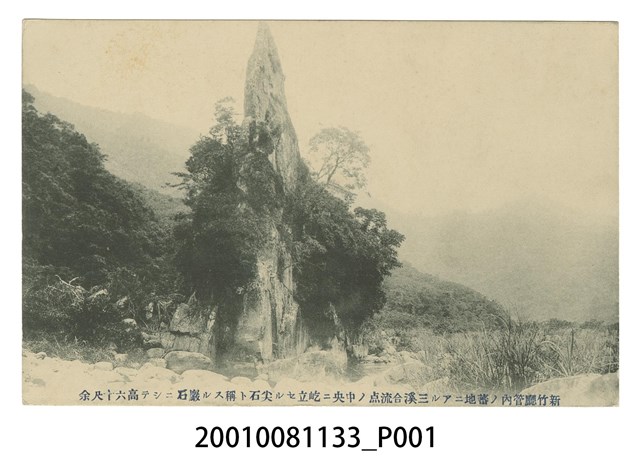 新竹廳管內ノ蕃地ニアル三溪合流點ノ中央ニ屹立セル尖石ト稱スル巖石ニシテ高六十尺余
