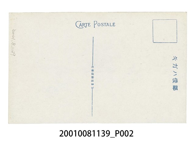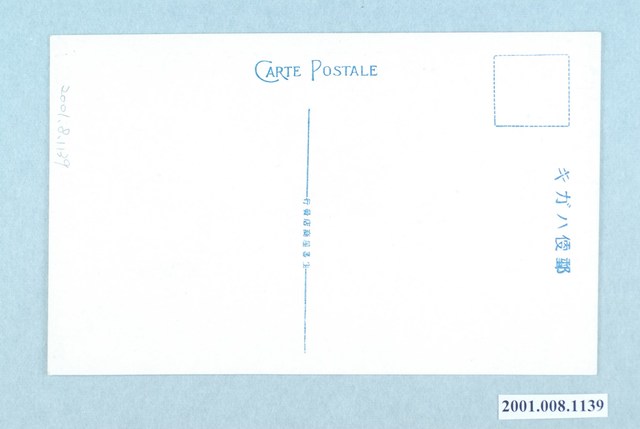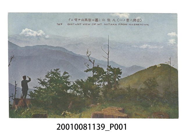 1. 本物件以八仙山為主題之明信片,其正面為八仙山彩色繪圖,影像中有一身著深色衣服,頭戴帽子的男子,向遠方的山巒敬禮,影像上方註有兩段文字,由上至下「(台灣八景ノ一)八仙山(遙ニ新高山ヲ望ム)」,「167 DISTANT VIEW OF MT NITAKA FORM HASSENZAN.」。背面為空白明信片橫式書寫面,以藍色單色印刷,右上角有郵票黏貼處,右側位置印有「郵便ハガキ」,上方印有「CARTE POSTALE」,中央分隔線中間位置有「生蕃屋商店發行」的小字。2.1927年,「臺灣日日新報社」進行讀者票選,選出了臺灣「八景十二勝」,為日月潭、八仙山、鵝鑾鼻、太魯閣峽、淡水、壽山、阿里山和基隆旭岡(今旭丘山)。此張明信片為八仙山遠望新高山之景色,同2001.008.1140之圖像,但圖像上的敘述文字略有不同。 背面有生蕃屋商店發行字樣。