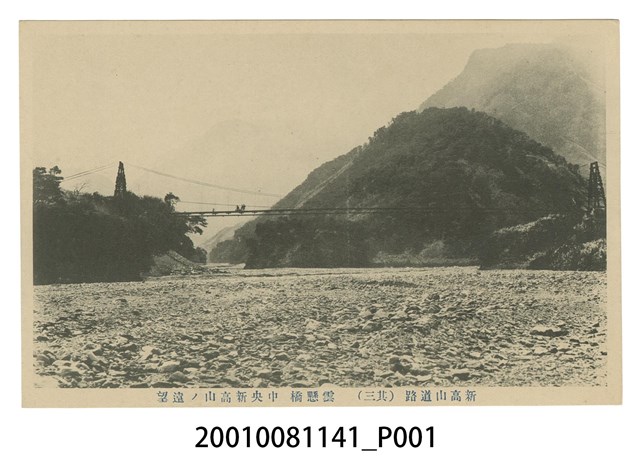 1.多色印刷明信片,影像內容為臺中州新高登山道路上的雲懸橋吊橋,從雲懸橋中央遠望新高山(玉山),吊橋上有2人推車行走。
