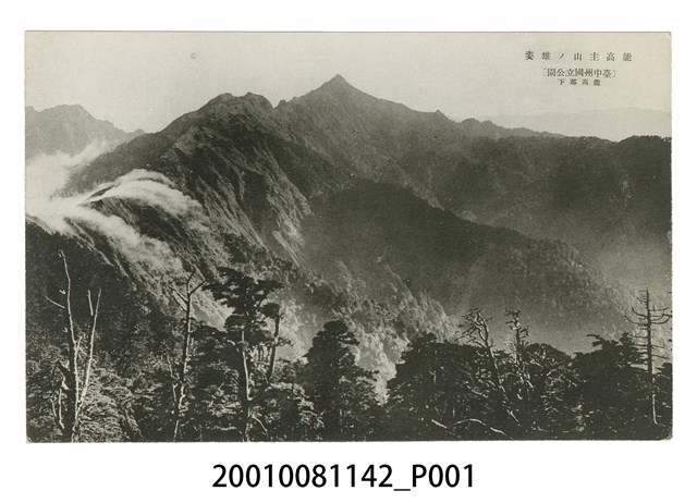 2.能高主山ノ雄姿[臺中州國立公園]能高郡下(T020301_02_1018),臺灣史檔案資源系統,中央研究院臺灣史研究所, 2014/07/16。