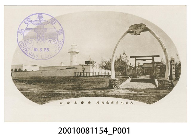 1.單色印刷明信片,影像內容為鵝鑾鼻神社,位於鵝鑾鼻燈塔旁,入口前方有一座東洋捕鯨會社奉獻的鯨魚骨鳥居。 2.正面影像黑白印刷、做扇形設計,下方有說明文字:「大日本帝國最南端鵞鑾鼻神社」,左上角蓋有「鵞鑾鼻燈臺、SOUTH CAPE LIGHT HOUSE、10.5.25」圓戳印,戳印日期應為昭和10年(1935)5月25日。背面則印有灰色文字「郵便はかき、POST CARD」,及郵票黏貼方框。