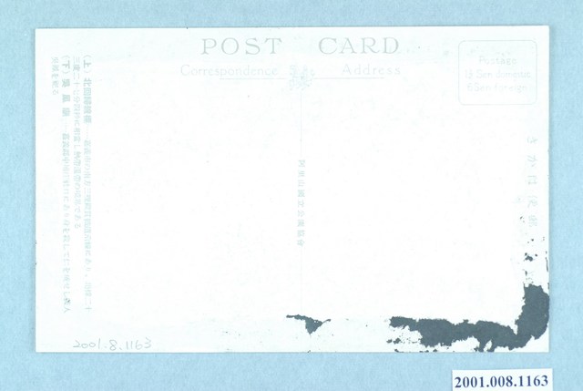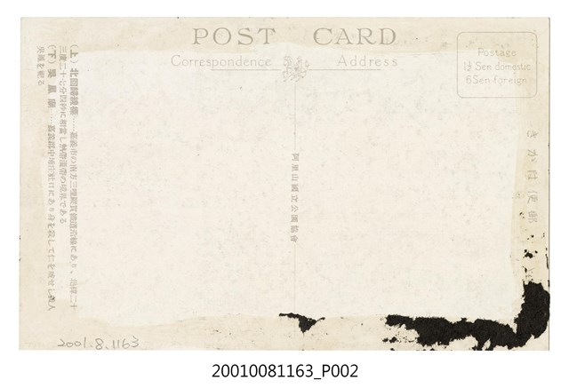 1. 本物件為以北回歸線地標與吳鳳廟為主題之明信片,其正面為兩張彩色繪圖,右上北回歸線標彩色繪圖,圖中有一白色的塔式標的物佇立;左下為吳鳳廟彩色繪圖,圖中為一棟廟宇式建築,正面皆沒有任何文字標註。背面為空白明信片橫式書寫面,以黑色單色印刷,右上角方框中印有「Postage 1½ Sen domestic 6 Sen foreign.」,右側標註「郵便はがき」,左側位置註有兩段文字:「(上)北回歸線標……嘉義市の南方三哩縱貫鐵道沿線にあり、北緯二十三度二十七分四秒に相當し熱帶溫泉の境界てある」、「(下)吳鳳廟......嘉義郡中埔庄社口にあり身を殺して仁を成せし義人吳鳳を祀る」(大意為:北回歸線標位於北緯二十三度二十七分四秒的地方;吳鳳廟位於嘉義郡中埔庄社口,廟內祀奉殺身成仁的義人吳鳳。)分隔線上方有一飛馬圖樣,圖樣右側標有「Address」、左側為「Correspondence」,上方為「POST CARD」,分隔線中央位置以中文小字印刷「阿里山國立公園協會」。2. 嘉義北回歸線標設置於西元1908年,位於今嘉義縣水上鄉。從嘉義發車後右邊車窗可以看到,北緯23度37分4秒51、東經120度24分46秒5的地方,在這個地點以南熱帶色彩會越來濃厚。3. 吳鳳是漳州平和縣人,於西元1722年在臺灣阿里山擔任蕃割,傳說當時阿里山山蕃性格兇猛,喜好馘首,吳鳳為矯正此一風俗犧牲自己,並因此改善了馘首之風俗。佐久間總督因此頒發「殺身成仁」的匾額。但本傳說因有許多爭議,為免造成刻板印象與族群融合之困擾,近年來已少見提起。吳鳳廟相傳創建於1820年,位於今嘉義縣中埔鄉。