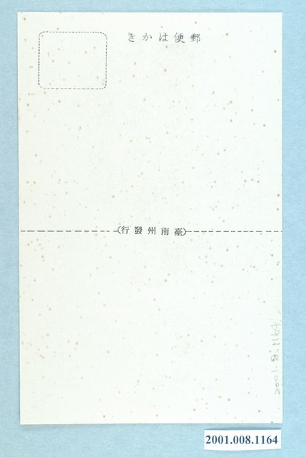 1. 本物件為以北回歸線標及檳榔樹與水牛為主題之明信片,其正面為兩張黑白照片,右方橢圓形為北回歸線標黑白照片,下方標註兩段文字「北回歸線標」、「(嘉義郡水上庄)」,影像中有一以圓球為頂的石塔,石塔正面寫有「北回歸線標」;左邊方形為檳榔樹與水牛黑白照片,下方標註為「檳榔樹ト水牛」,影像中央有1名男性與水牛站立於窪地,其後方種植有1排檳榔樹。背面為空白明信片直式書寫面,以黑色單色印刷,左上方有郵票黏貼處,右邊標有「郵便はがき」,中間有一條虛線分隔線,並於中央位置印有「(臺南州發行)」。2. 嘉義北回歸線標設置於西元1908年,位於今嘉義縣水上鄉。從嘉義發車後右邊車窗可以看到,北緯23度37分4秒51、東經120度24分46秒5的地方,在這個地點以南熱帶色彩會越來濃厚。