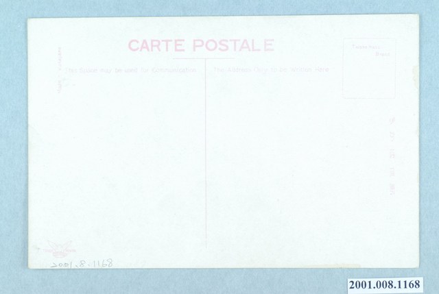 本物件為以嘉義街上水果買賣情形為主題之明信片,其正面為水果買賣情形黑白照片,影像前方有一扁擔,上方擺放香蕉,有兩名帶著孩童的婦人正向戴著斗笠的商人進行買賣,左側的婦人手中抱有1名嬰孩,影像右下角處白色方框內標有「臺灣所見」,左上角有標註及描述:「嘉義街上の果物賣」、「旅に出て街上に物賣ろ人を見ろこごはたしかに一種セソテイメンタルな気分をそそろ。臺灣はバナナの國!可愛い子供を連れた本島婦人が街頭でバナナを買つてゐろ風俗も珍らしくなささうでまたごても珍らしい」(大意為:旅途中見到街上的攤販買賣情形為異國風情的一種。臺灣是香蕉之國,婦人帶著可愛的孩子購買香蕉的情況對旅人是珍稀難見的,但對他們卻是習以為常)。背面為空白明信片橫式書寫面,以粉紅色單色印刷,右上角有一方框,內標註「Place Postage Here」,右側標註「郵便はがき」,左下角位置有一隻張開雙翼,爪持一面圓形的鳥,並於兩旁分別寫有「TRADE」、「MARK」,明信片左上角位置以小字標示「Made in Wakayama」,上方印有「CARTE POSTALE」,其下方右側「The Address Only to be Written Here」,左側「This Space may be used for Communication」,中間有一條分隔線。