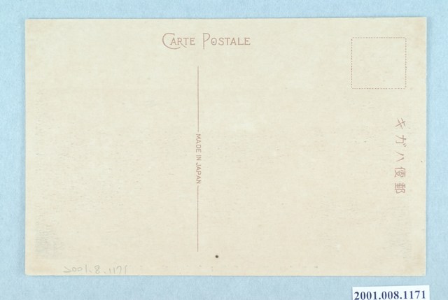 1.本物件以校舍為主題之明信片,其正面為3張黑白照片,右上方橢圓形為笠井前校長黑白照片,有1位身著淺色衣服,留著鬍子的男性,中間為一建築物黑白照片,是1座中式的廟宇建築,左上方為林前校長黑白照片,有1位身著軍服並帶著軍帽手持軍刀留著鬍子的男性,明信片下方註有「創立當時の校舍と笠井(右) 林(左)前校長」、並於左下角位置標有阿拉伯數字「4」。背面為空白明信片橫式書寫面,以紅褐單色印刷,右上角有郵票黏貼處,右側位置印有「郵便ハガキ」,上方印有「CARTE POSTALE」,中央分隔線中間位置有「MADE IN JAPAN」的小字。從物件中無法得知是何學校,但經查應為嘉義公學校,笠井校長全名應為笠井源作。2.嘉義公學校創立於西元1898年,1919年改稱嘉義第一公學校,1932年又改名為玉川公學校。戰後數度改制,現為嘉義市崇文國小。