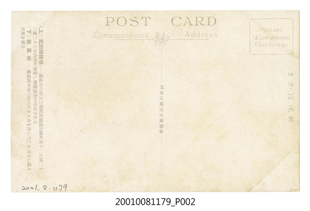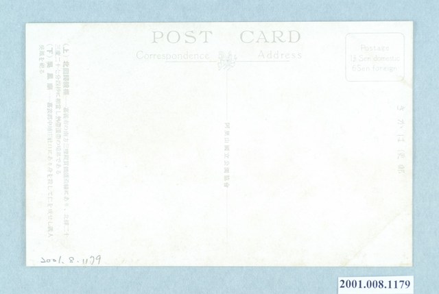 1. 本物件為以北回歸線地標與吳鳳廟為主題之明信片,其正面為兩張彩色繪圖,右上北回歸線標彩色繪圖,圖中有一白色的塔式標的物佇立;左下為吳鳳廟彩色繪圖,圖中為一棟廟宇式建築,正面皆沒有任何文字標註。背面為空白明信片橫式書寫面,以黑色單色印刷,右上角方框中印有「Postage 1½ Sen domestic 6 Sen foreign.」,右側標註「郵便はがき」,左側位置註有兩段文字:「(上)北回歸線標……嘉義市の南方三哩縱貫鐵道沿線にあり、北緯二十三度二十七分四秒に相當し熱帶溫泉の境界てある」、「(下)吳鳳廟......嘉義郡中埔庄社口にあり身を殺して仁を成せし義人吳鳳を祀る」(大意為:北回歸線標位於北緯二十三度二十七分四秒的地方;吳鳳廟位於嘉義郡中埔庄社口,廟內祀奉殺身成仁的義人吳鳳。)分隔線上方有一飛馬圖樣,圖樣右側標有「Address」、左側為「Correspondence」,上方為「POST CARD」,分隔線中央位置以中文小字印刷「阿里山國立公園協會」。2. 嘉義北回歸線標設置於西元1908年,位於今嘉義縣水上鄉。從嘉義發車後右邊車窗可以看到,北緯23度37分4秒51、東經120度24分46秒5的地方,在這個地點以南熱帶色彩會越來濃厚。3. 吳鳳是漳州平和縣人,於西元1722年在臺灣阿里山擔任蕃割,傳說當時阿里山山蕃性格兇猛,喜好馘首,吳鳳為矯正此一風俗犧牲自己,並因此改善了馘首之風俗。佐久間總督並因此頒發「殺身成仁」的匾額。但本傳說因有許多爭議,為免造成刻板印象與族群融合之困擾,近年來已少見提起。吳鳳廟相傳創建於1820年,位於今嘉義縣中埔鄉。