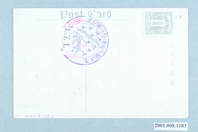 1. 本物件為以臺灣臺南關子嶺講習所為主題之明信片,其正面為講習所建築物外觀黑白照片,影像右上角標註兩段文字「(台灣關子嶺)」、「州下市街庄のを集めて 成れる絕好の關子嶺講習所」(大意:由州下市街集資建成的關子嶺講習所)。背面為空白明信片直式書寫面,以灰色單色印刷,左上角方框印有圖樣,中間為阿拉伯數字「1」數字上方由上至下為英文字「JYOHOKU」、「城北」,下方為「JYOHCKU」、「SHASHIN INSATSU SHA」,,方框內右邊為英文大寫「T」、左邊為「S」,明信面上方標有「郵便はがき」,左側印有「POST CARD」,中間分隔線偏左位置處蓋有一個圓形的紀念戳章,上方刻有「臺灣關子溫泉行樂紀念」,下方標有數字「10.7.1.」,兩旁有紅色的溫泉符號。2. 關子嶺位於臺南市白河區東側,為含硫磺成分的鹼性碳酸溫泉,在日治時期與陽明山、北投、四重溪三個溫泉勝地並列為臺灣四大名湯。