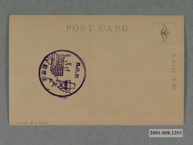 1.本物件為以臺灣出磺坑油田為主題之明信片,其正面為出磺坑油田黑白照片,影像左邊有一座鐵塔建築物,明信片左下角位置標有「日本石油株式會社 臺灣出磺坑油田」。背面為空白明信片直式書寫面,以黑色單色信刷,左上角方框內有蝙蝠圖樣,方框右側標有「郵便はがき」,下方蓋有一藍紫色圓形戳章,圖案為煙囪及工廠廠房,上方為數字「11.11.28」,下方為「造橋駅」,左側標有「POST CARD」,中間有一道分隔線。