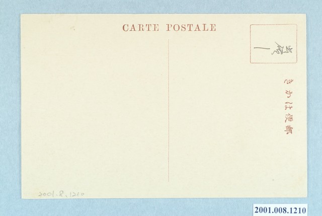 1. 本物件為以新竹州出磺坑油田為主題之明信片,其正面為出磺坑油田景觀黑白照片,影像為山坡地景觀,共有8座鐵架搭建的鐵塔,以及5間平房位於山坡地上,影像下方標註為「臺灣新竹州出磺坑油田」,左側位置標有「日本石油株式會社」。背面為明信片直式書寫面,以紅色單色印刷,左上角方框中留有字跡「出磺─」、方框右側為「郵便はがき」,左方標註「CARTE POSTALE」,中間有一虛線作分隔線。