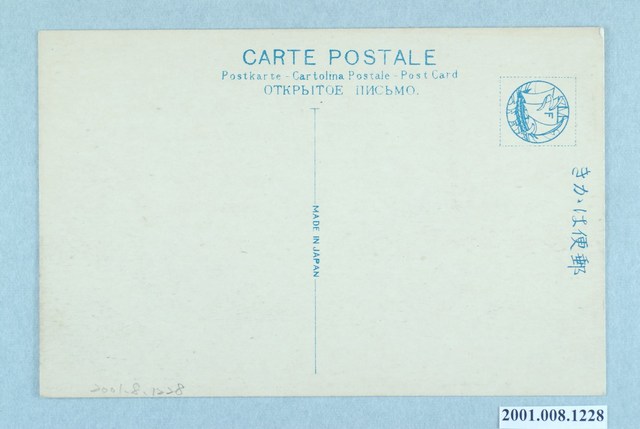 1. 本物件為以臺灣製糖株式會社為主題之明信片,其正面為臺灣製糖株式會社黑白照片,右邊廠房上的圓形框內標有符號「$」,廠房區內有4座煙囪佇立,影像下方由右至左標註「臺灣製糖株式會社(橋仔頭)」、「Taiwan Sugar Refining Co., Formosa」、「847」。背面為空白明信片直式書寫面,以藍色單色印刷,左上方框有帆船插畫,船帆上寫有「F」,方框右方為「郵便はがき」,左側標註三段文字「CARTE POSTALE 」、「Postkarte-Cartolma Postale- PostCard」、「ОТКРЬІТОЕ ІІИСЬМО」,中間分隔線上標有「MADE IN JAPAN」。2. 西元1900年臺灣製糖株式會社成立,並於該年年底選定橋仔頭作為設廠地點,1901年興建臺灣第一座現代化機械式製糖工廠。