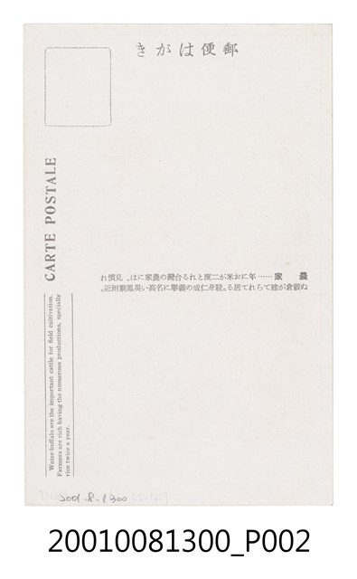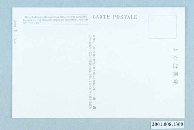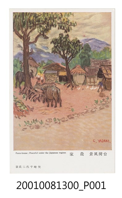 2.矢崎千代二(1872-1947)與石川欽一郎為同一輩畫家,擅長以粉彩速寫,捕捉旅行所見,昭和12(1937)年曾於臺北鐵道飯店舉辦過粉彩畫展,展出從北到南的臺灣名景,其中「日本旅行協會臺灣支部」精選其部分畫作,發行風景明信片。此張明信片描繪嘉義吳鳳廟附近農村的景色,土埆厝旁建有2座穀倉(古亭畚),存放一年二獲的稻米,並養有水牛,協助耕種,一付和平、溫馨的景象,如同此張明信片的英文標題所寫「Peaceful under the Japanese regime和平的在日本統治之下」。