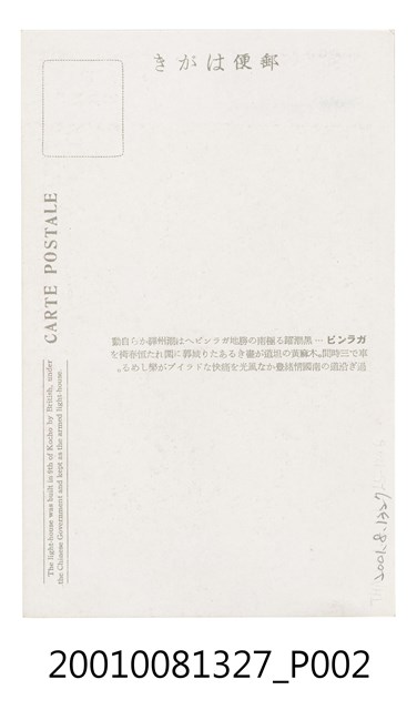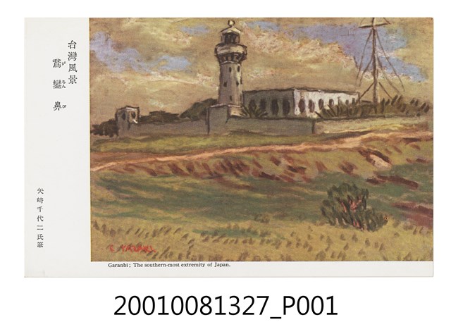 1.矢崎千代二以粉彩畫「鵝鑾鼻燈塔」,上印有落款「C. YAZAKI.」,為矢崎氏所繪「臺灣風景」系列明信片之一。正面說明文字:「台灣風景、鵞鑾鼻、Garanbi; The southern-most extremity of Japan.、矢崎千代二氏筆」,背面除印刷有「CARTE POSTALE、郵便はがき」外,以日文、英文二種語言介紹「The light-house was built in 9th of Kocho by British, under the Chinese Government and kept as the armed light-house.」、「ガランビ…黑潮躍る極南の勝地,ガランビへは潮州驛から自動車で三時間。木麻黃の坦道が盡きるあたり城郭に圍れた恒春街を過ぎ沿道の南國情緒豊かな風光を痛快なドライブが樂しめる。」(譯:鵝鑾鼻,是黑潮流經的極南勝地,從潮州站搭車往鵝鑾鼻需3小時。木麻黃平坦大道的盡頭是被城牆圍起的恆春街。可以痛快享受奔馳於沿途充滿南國情調的風光樂。)本件約為1937-1940年間發行。