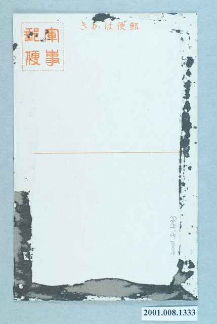 1. 本物件以愛國行進曲為主題之明信片,其正面為附有愛國行進曲歌詞彩色繪圖,中央偏左位置有7名身著墨綠色軍服的軍人,其中有3名軍人拿著刺槍,右側有1位留著鬍子的軍人,拿著軍刀,軍人門的後面有雲隙光自天空照射至地面,右上方標註「國民精神總動員協賛 內閣情報局當選歌」、「愛國行進曲」,以及歌詞「(三)起て一系の大君を 光と永久に戴きて 臣民我等皆共に 御稜威に副はむ大使命」(來吧,我等臣民,效忠、愛戴天皇,以追隨天皇皇威為大使命。)背面為空白明信片直式書寫面,以橘色單色印刷,右上方框中有「軍事郵便」,上方有「郵便はがき」、下方有「Matsumura.Co.」、中間有一條分隔線。2. 西元1937年蘆溝橋事變發生後,為號召人民效忠國家的精神,日本推行國民精神總動員行動,並由內閣情報部公開徵求「愛國行進曲」。