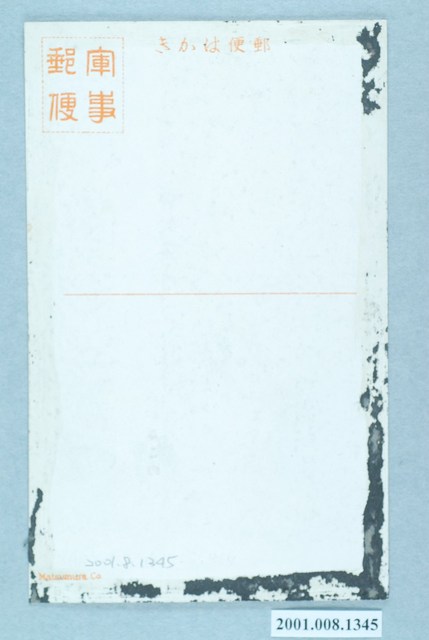 1. 本物件為以軍歌為主題之明信片,其正面為附有進軍之歌歌詞彩色照片,上半部分為軍人彩色照片,影像為穿著墨綠色軍服,頭戴鋼盔,背著刺槍列隊行走的軍人隊伍,旁邊有圍觀的群眾以及兩台人力車,下半部分為歌詞,以黃色繪有行徑中的軍人隊伍之浮水印,上方標註「軍歌」「進軍の歌(一)」、「雲わきあがるこの朝 旭日の下敢然と 正義に起てり大日本 執れ膺懲の銃と劍」(朝風雲湧起,旭日下揚起大日本的正義,將用槍和劍來執行。)背面為空白明信片直式書寫面,以橘色單色印刷,,右上方框中有「軍事郵便」,上方有「郵便はがき」、下方有「Matsumura.Co.」、中間有一條分隔線。