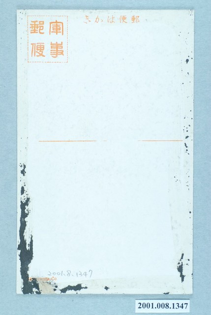 1. 本物件為以軍歌為主題之明信片,其正面為附有進軍之歌歌詞彩色照片,上半部分為軍艦一角彩色照片,影像為1艘軍艦,軍艦上空有4架飛機列隊飛行,下半部分為歌詞,以黃色繪有在海上航行的四艘軍艦之浮水印,上方標註「軍歌」「進軍の歌(三)ノ一」、「廣漠の土 咆ゆる海 越えゆくところ 嚴然と」(無論是廣大荒蕪的土地,還是咆哮的大海,都將能跨越」)。背面為空白明信片直式書寫面,以橘色單色印刷,,右上方框中有「軍事郵便」,上方有「郵便はがき」、下方可辨識有「ura.Co.」、中間有一條分隔線。