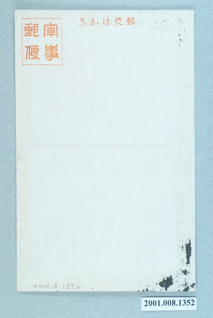 本物件為軍事類明信片,其正面為軍人彩色繪圖,繪圖中有一間土黃色的帳篷,帳篷外有一名持槍守備,身穿墨綠色禦寒軍服,頭戴鋼盔的士兵,其身後有一面日本國旗。背面為空白明信片直式書寫面,以橘色單色印刷,右上方框中有「軍事郵便」,上方有「郵便はがき」、中間有一條分隔線。