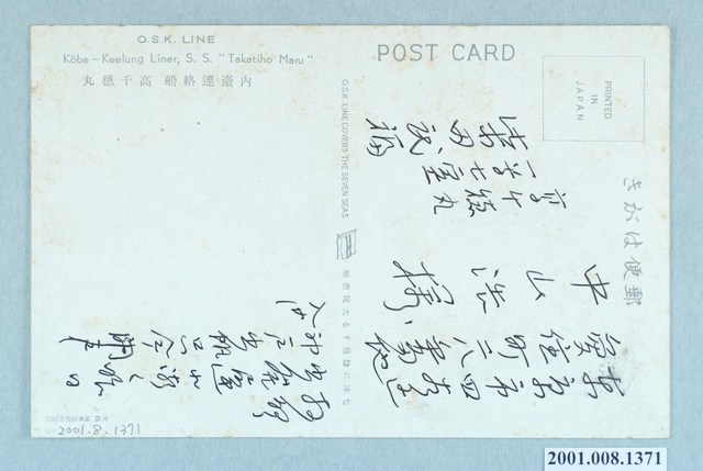 1. 本物件為以內臺連絡船為主題之明信片,其正面為高千穗丸彩色圖片,圖片中為高千穗丸於海面上航行,其船身為黑色,上方標有「たかちほ丸」,船上有1座煙囪,前後兩端各有1根桅桿。背面為明信片書寫片,以黑色單色印刷,有書寫文字,右上方框內標有「PRINTED IN JAPAN」、上方有「郵便はがき」,右下方標註「大阪極東印刷所印製」,左下方標註「O.S.K. LINE」、「Kōbe─Keelung Liner, S.S."Takatiho Maru"」、「內臺聯絡船高千穗丸」,左上方「POST CARD」,中間位置標有「O.S.K. LINE COVERS THE SEVEN SEAS」、「七洋に雄飛する大阪商船」。上方為收件人及寄件人的地址與姓名,下方為傳達之問候。2. 高千穗丸號為來往航行於臺灣及日本之間的定期船,屬於大阪商船株式會社。