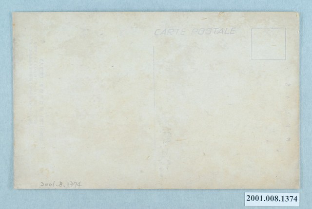 1. 本物件為以臺灣情調為主題之明信片,其正面為兩名客家農婦站立於水田中的彩色照片,影像中左方為頭戴斗笠,身穿白色衣服,載著手套拿著竹竿的農婦,右方為撐著油紙傘,身著紅色衣服,同樣拿著竹竿的農婦手持油紙傘。背面為空白明信片橫式書寫面,以藍紫色單色印刷,右上方框為郵票黏貼處,右側標有「郵便はがき」、中間偏右位置標示「CARTE POSTALE」,中間有一道分隔線。左側有一些說明字,上排為「(臺灣の情緒)田の草取り(廣東人)」,下2排小字模糊不清無法辨認。