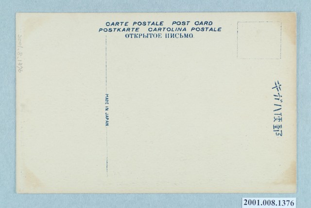 1. 本物件為以本島人的稻米收割情景為主題之明信片,其正面為農夫收割稻米黑白照片,影像中三名戴著斗笠的農夫將成熟的稻穗收割成束,並於稱為「甩桶」的甩穀機前排隊,以將稻穀與稻稈分離,甩穀機上架有網子,防止稻穀飛出,右側手持稻穗的農夫,嘴上啣著一把收割稻穗的鐮刀,影像下方標註:「(台灣)本島人稻刈取リノ景」、「Custom of Formosa」、「(鈴木勇進堂發行)」、「39」。背面為空白明信片橫式書寫面,以藍色單色印刷,右上角有一方框為郵票黏貼處,右側部分寫有「郵便ハガキ」,正中央上方寫有三段文字,由上至下為「CARTE POSTALE POST CARD」、「POSTKARTE CARTOLINA POSTALE」、「ОТКРЬІТОЕ ІІИСЬМО」,中央偏左有一道分隔線,並標有「MADE IN JAPAN」。