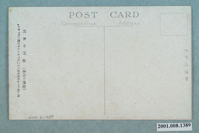 本物件為以臺灣印象為主題之明信片,其正面為木匠鋸木彩色照片,影像中有兩名分別穿黃色衣服及藍色衣服的木匠,各拿鋸子的一邊鋸木頭,右側為以木頭堆砌的平面,左後面有一臺木製的四輪車子。背面為空白明信片橫式書寫面,以黑色單色印刷,右上方框為郵票黏貼處,右側有「郵便はがき」,左側「(臺灣の印象)臺灣の木挽」、「長い柄のついた鉅を以つて二人で大きな木を挽くのである。」(大意為:兩人使用鋸子合力鋸木。)上方標註:「POST CARD」,其下左側「Correspondence」、右側「Address」,中間有一條分隔線。