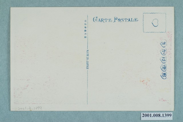 2.正面彩色影像,四周留白邊框,下印有黑色說明文字「臺灣蕃界の釣橋、(63)THE SUSPENSION-BRIDGE IN BOUNDARIES OF FORMOSA.」。背面印有藍色文字「郵便はかき、CARTE POSTALE、臺北藤倉發行、MADE IN JAPAN」,其中「郵便はかき」五字以心形圖案框邊,郵票黏貼方框內有心形商標圖案。