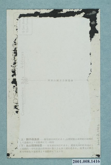 1.阿里山國立公園協會發行之多色印刷明信片,影像內容包括2張圖,左上為臺南州關子嶺溫泉街景,右下為俯視形狀如珊瑚的烏山頭水庫的湖光山色。2.正面影像為左上右下2張圖,無文字,背面印有灰色文字「郵便はかき、POST CARD、Correspondence、Address、阿里山國立公園協會」,以及說明文字:「(上)關子嶺溫泉……新營郡白河庄にあり、山間閑雅山水明媚の仙境にして嘉義市より自動車にて一時間。(下)烏山頭珊瑚潭……曾文郡官田庄にあり、嘉南大圳の貯水池にして面積約一千町步其の狀珊瑚に似たるを以て此の名あり、綠翠水に映じ風光明媚なり嘉義市より自動車にて五十分。」(譯:上圖為關子嶺溫泉,位於新營郡白河庄,山間閑雅、風光明媚的仙境,從嘉義市搭汽車1小時車程。下圖為烏山頭珊瑚潭,位於曾文郡官田庄,是嘉南大圳的蓄水池,面積約1千町步,因其形狀與珊瑚相似而得名,綠色湖水映照出美麗的風景,從嘉義市搭汽車50分車程。)通信欄與地址欄分隔線上有飛馬商標圖案,郵票方框印有面額文字「Postage 1 1/2 Sen domestic、6 Sen foreign」。3.阿里山國立公園協會是為推動新高阿里山國立公園之成立,於1931(昭和6)年4月由嘉義市官方與民間共同設立,置於嘉義市役所庶務課之下。預算一部分來自嘉義市及臺南州補助,大部分由地方人士捐獻。(曾祥宇、曾明德撰寫)