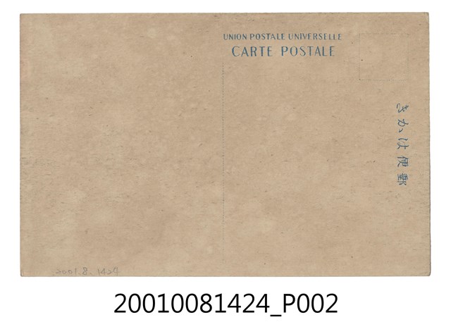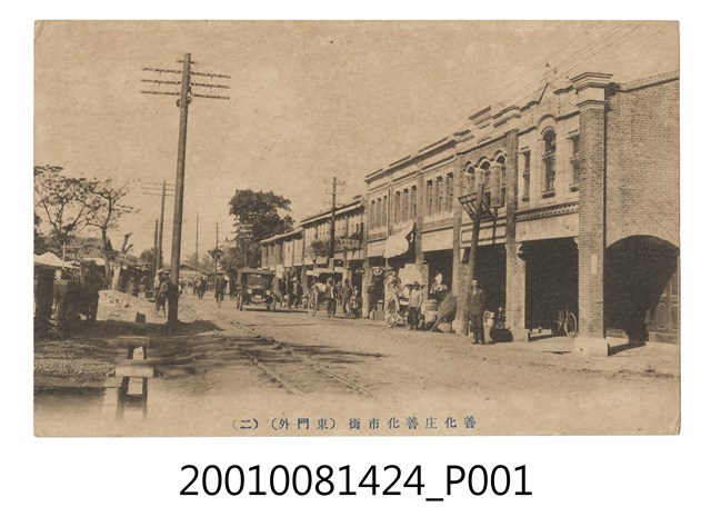 1.本物件為以善化市街為主題之明信片,其正面為善化市街黑白照片,畫面中可見已有洋樓式建築,且路上人車鼎沸,下方有1段文字「善化庄善化市街(東門外)(二)」;背面為空白明信片直式書寫面,以藍色單色印刷,左上為郵票黏貼處,上方有「郵便はかき」字樣,左側有2行字樣,由左至右為「UNION POSTALE UNIVERSELLE」、「CARTE POSTALE」。2.善化地區從荷治時期即開始有所發展,原為西拉雅族目加溜灣社的所在地,荷蘭東印度公司則以威脅利誘的方式使平埔族臣服,清領時則以灣裡稱呼之,至西元1920年改稱為善化庄,而日治時期因灣裡糖廠與善化火車站的設立,使善化地區更加蓬勃發展。