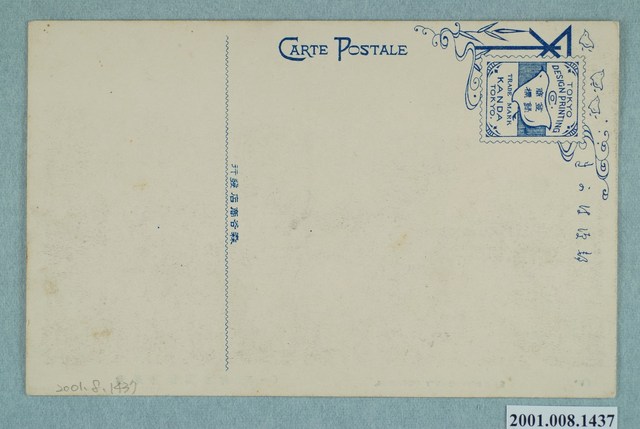 1.本物件為以蕃薯寮市街為主題之明信片,其正面為蕃薯寮市街黑白照片,畫面中僅可見檳榔樹林與遠方山巒,並無見所謂市街,右下有1段文字「台灣蕃薯寮市街(其一)」,左下有1段文字「(い)BANSHORYO CITY FORMOSA.」;背面為空白明信片直式書寫面,以深藍色單色印刷,左上為郵票黏貼處,內有由上至下「TOKYO DESIGNPRINTING」、「 TRADE MARK」、「登陸商標」、「TRADE MARK」、「 KANDA TOKYO」字樣,附近有花邊與鳥裝飾,上方有「郵便はがき」字樣,左側有「CARTE POSTALE」字樣,中下有「森谷商店發行」字樣。2.蕃薯寮為高雄旗山之舊地名,光緒年間稱太平街,日治後社蕃薯寮廳,至西元1920年更名為旗山街,旗山地區於清領時期之發展有限,至日治後因新式製糖式業與市區改正才逐漸繁華起來,今仍可見旗山老街兩旁的西洋式建築。