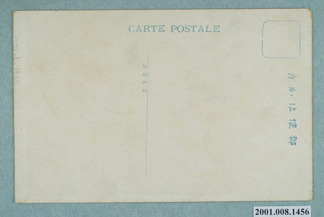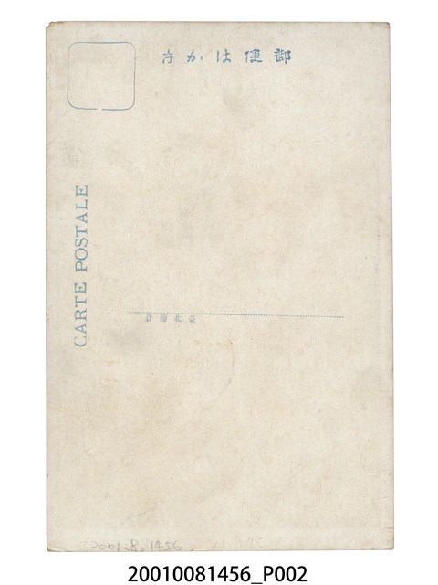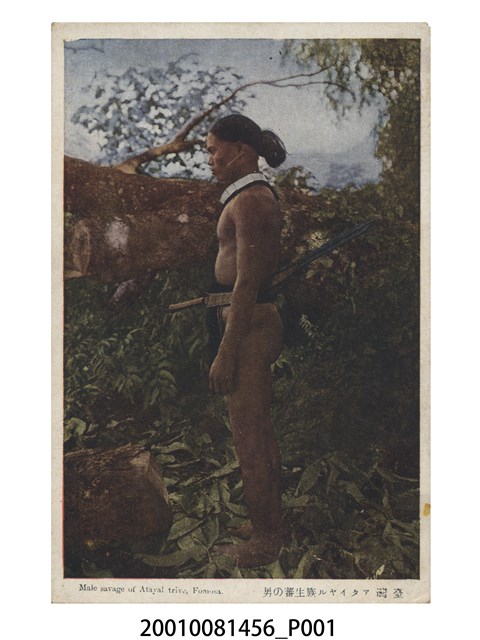 本件是以泰雅族獵人為主題之明信片,男子頭髮後梳綁束腦後、雙耳穿耳管、脖子上配戴貝片頸飾、左腰間綁繫獵刀、下身著遮陰布,為側面全身照片。照片下方搭配「臺灣アタイヤル族生蕃の男 Male savage of Atayal trive, Fomosa」印刷文字。明信片背⾯右上⾓方框為郵票黏貼處,中央偏下方有道分隔線標有「臺北藤倉」字樣,其餘空白處印刷文字「郵便はがき CARTE POSTALE」。