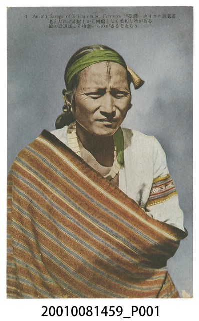 1. 日本時代有色印刷明信片,圖片影像為泰雅族老人上半身特寫,男子頭上綁縛綠色頭巾,束髮於後頸,左耳上插著一隻竹製煙斗,額頭與下巴刺有頤紋與頷紋。身著白色長袖上衣,露出左肩膀,自右肩斜向左臂披掛一條紅、黃、白、綠色條紋之披肩。